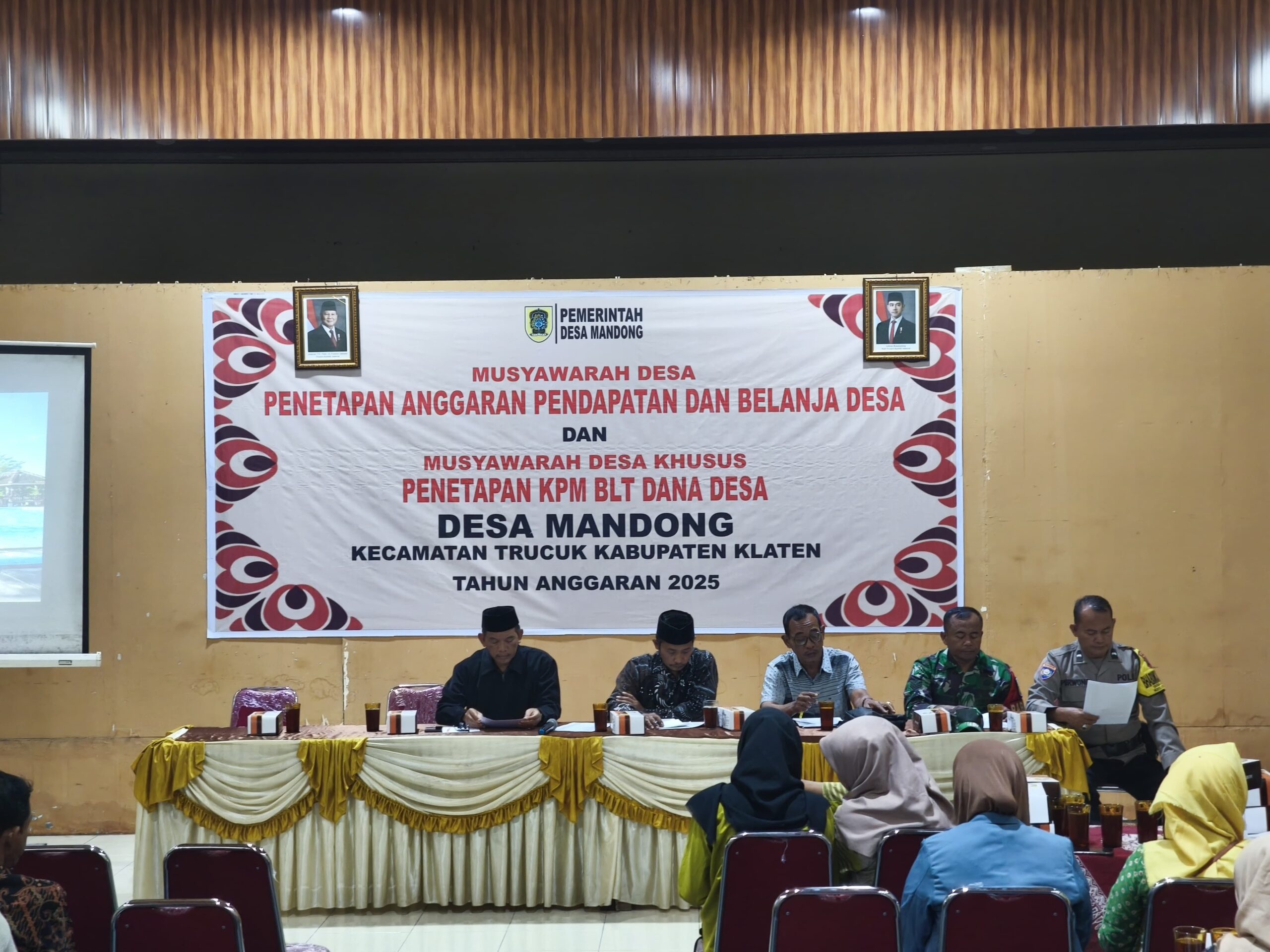 Mandong.Dalam rangka bentuk transparansi pengelolaan anggaran Pemerintah Desa Mandong menggelar MUSDES penetapan APBDES dan KPM BLT DD tahun Anggaran 2025 pada selasa 10 desember tahun 2024. Acara tersebut dihadiri oleh MUSPIKA, Kepala Desa dan seluruh perwakilan lembaga desa dan tokoh masyarakat Mandong.Dalam sambutannya Kepala Desa Mandong Heru Sadmoko, SS menyampaikan “kegiatan ini adalah bentuk transparansi kami di dalam pengeloaan anggaran”.