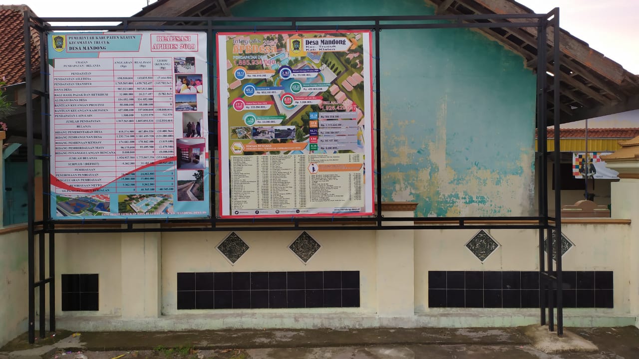 Sebagai salah satu bentuk transparansi keterbukaan Publik tentang pengelolaan keuangan desa dan pelaksanaan Anggaran Pendapatan dan Belanja Desa Tahun Anggaran 2020 Kepala Desa Mandong Bapak Sarwono, S.Pd memerintahkan untuk memasang Banner tentang Ringkasan APBDes Tahun 2020 atau Banner Infografis APBDes 2020. Banner infografis tersebut antara lain dipasang di Komplek Balai Desa Mandong, di Depan Balai Desa Mandong, tempat tersebut dipandang sangat strategis sehingga masyarkat dapat melihat secara jelas uraian singkat APBdes tersebut.