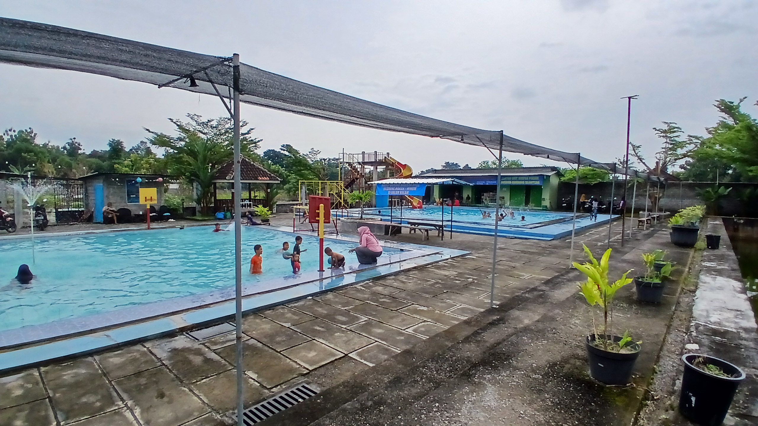 Minggu pagi ini suasana di kolam renang yang terletak di area gringsing ocean park ini tampak ramai oleh ibu ibu dan pengunjung. Tampak ibu-ibu yang asik mengikuti senam rutin minggu pagi dan anak-anak yang asik berenang didampingi orang tuanya. Di sisi kolam yang lain seorang instruktur/pelatih renang sedang semangat melatih anak2 yang belatih renang.